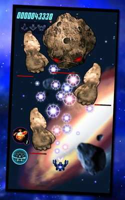 Ici, le joueur possède jusqu'à 3 vaisseaux par partie, qu'il peut choisir parmi des dizaines d'autres vaisseaux qu'il pourra débloquer, soit en terminant des missions, soit en dépensant des cristaux dans la boutique.